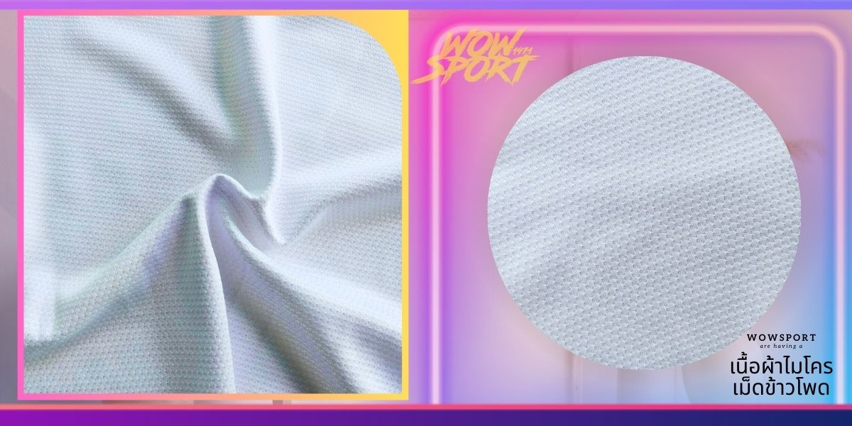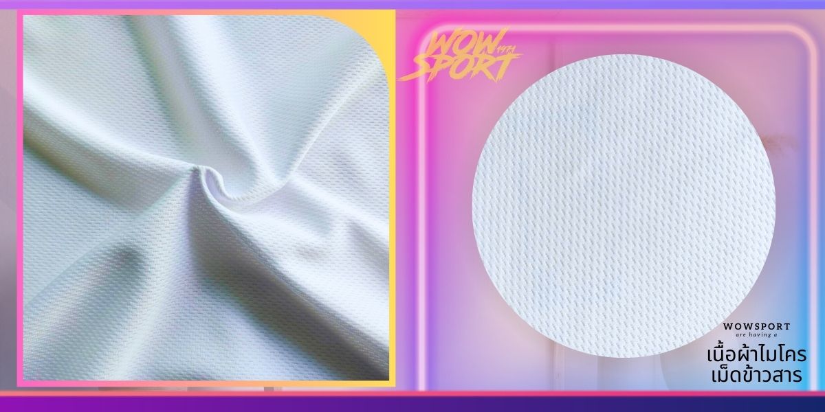 คุณสมบัติ : ผ้าเม็ดข้าวสารเนื้อไมโคร เป็นผ้าที่ทอด้วยเส้นใยไมโคร โพลีเอสเตอร์100% มี Texture ผ้าโครงสร้างเม็ดข้าวสาร จะมีลักษณะผ้าด้านนึงเป็นรู รูปวงรีเหมือนเม็ดข้าวสาร แต่รูไม่ทะลุ ส่วนอีกฝั่งจะเป็นลักษณะผ้าเรียบ โครงสร้างเช่นนี้จะช่วยให้เนื้อผ้าดูมีลูกเล่น และระบายอากาศได้ดี ไม่ยับไม่ย้วย และไม่ขึ้นขน สามารถใช้ด้านรูหรือด้านเรียบเป็นหน้าผ้าก็ได้แล้วแต่การออกแบบของลูกค้า ผ้าเม็ดข้าวสารนิยมนำไปทำ เสื้อกล้าม เสื้อบาส เสื้อวิ่งต่าง ๆ หรือนำไปทำเสื้อโปโลก็ได้เช่นกัน สามารถพิมพ์ซับลิเมชั่นได้